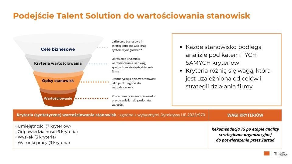Jeśli Państwa organizacja przygotowuje się do uporządkowania struktury stanowisk, wdrożenia wartościowania pracy lub dostosowania systemu wynagrodzeń do wymogów dyrektywy UE, eksperci Talent Solution wspierają firmy w projektowaniu rozwiązań dopasowanych do ich specyfiki.